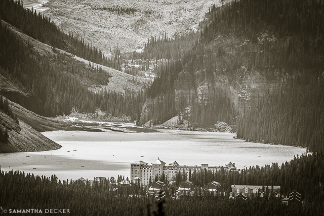 An iconic view of the Fairmont Château Lake Louise from the gondola offered me the opportunity to zoom in and capture the hotel and the lake in one shot.